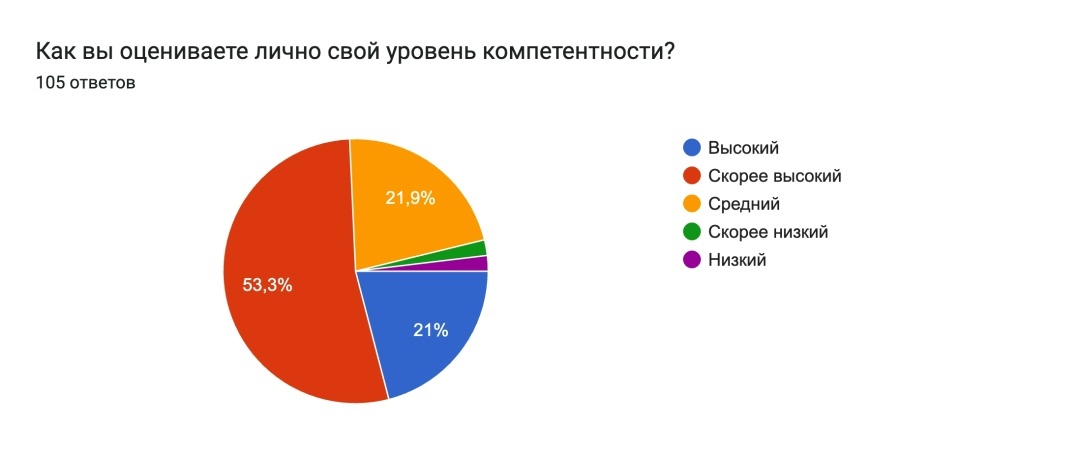 74,3% ответивших утверждают, что их уровень знаний выше среднего и относится к скорее высокому или высокому уровню. 21,9% считают себя экспертами.