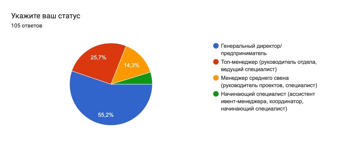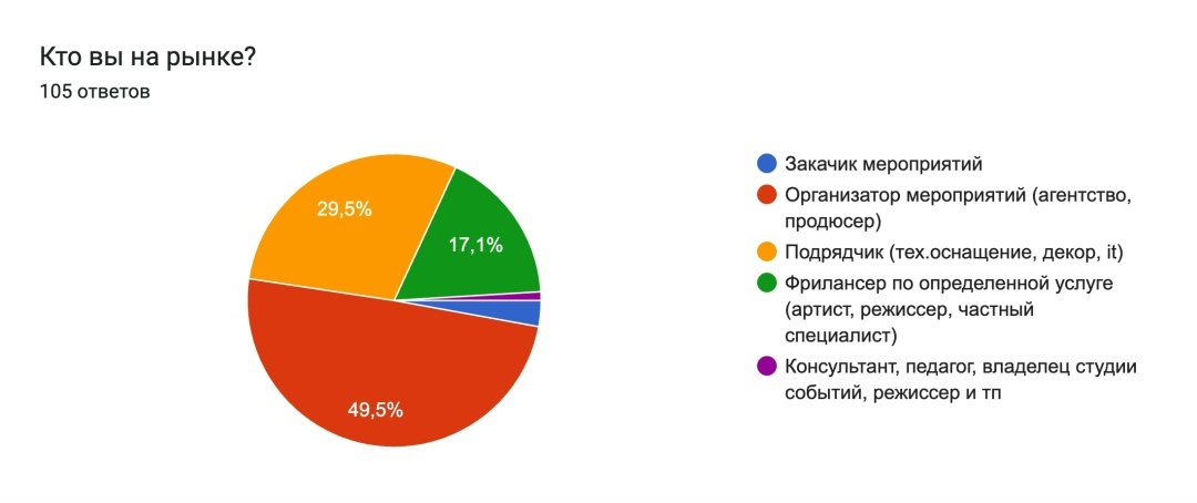 Мне ответили 105 человек. Опрос был размещен в моем личном канале, а также ряде многочисленных профильных ивент-чатах с разной аудиторией (чаты организаторов, фрилансеров, тех.специалистов и ряде других).