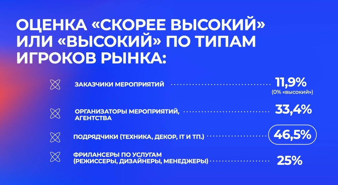 Самыми компетентными по мнению рынка оказались подрядчики (техника, декор, IT). На мой взгляд это логично, потому что именно они непосредственно руками делают наши проекты и отвечают за конечный результат. Им нужно обладать конкретной специальностью и профессионализмом, чтобы все на проекте заработало. Поэтому при общении с ними мы чаще видим осмысленность, и надеемся, что они не подведут.